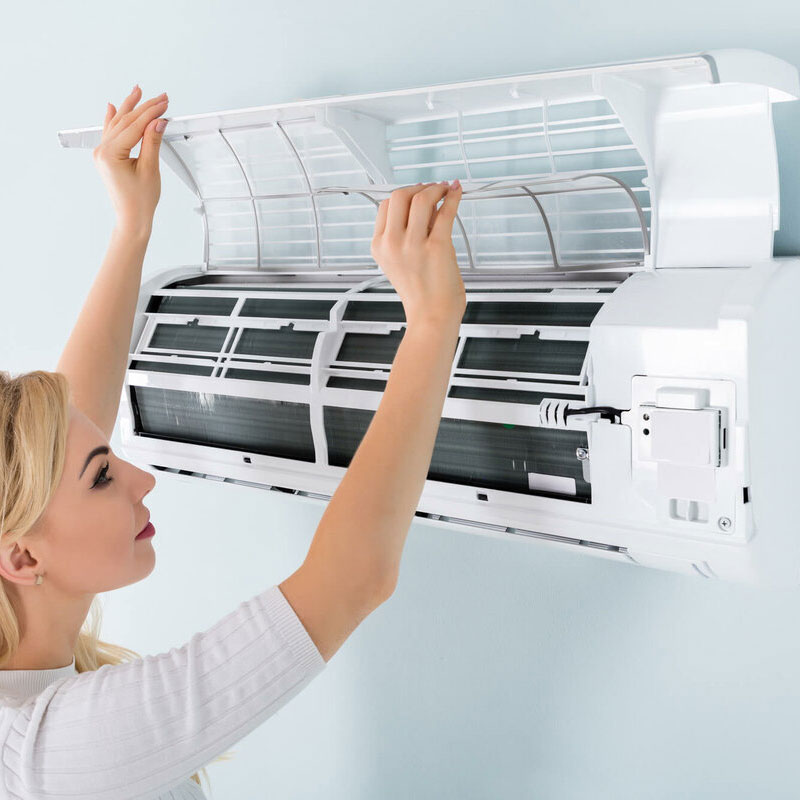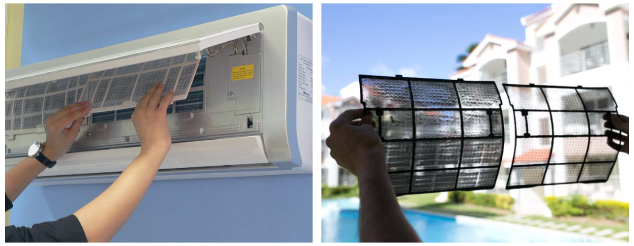 Насамперед потрібно отримати доступ до внутрішніх деталей спліт системи. Пристрій відключають від електричної мережі, підлогову зону під ним застеляють папером, целофановою плівкою або газетами. Щоб дістатися до фільтрів, необхідно відкрити кришку приладу, обережно підчепивши її з боків, потягнувши на себе, далі направивши вгору і довести до упору. Перед Користувачем відкриються сітчасті пластини, які потрібно акуратно витягти і промити в мильному розчині. Обполоснувши фільтри під проточною водою, ретельно просушивши (природним чином, за допомогою м'якої ганчірки) він може їх встановити на місце, яке заздалегідь очищено від пилу. Паралельно користувач може видалити бруд з цих елементів за допомогою потужного пилососа, щітки з довгим ворсом. Після цього майданчик слід протерти вологою ганчіркою.