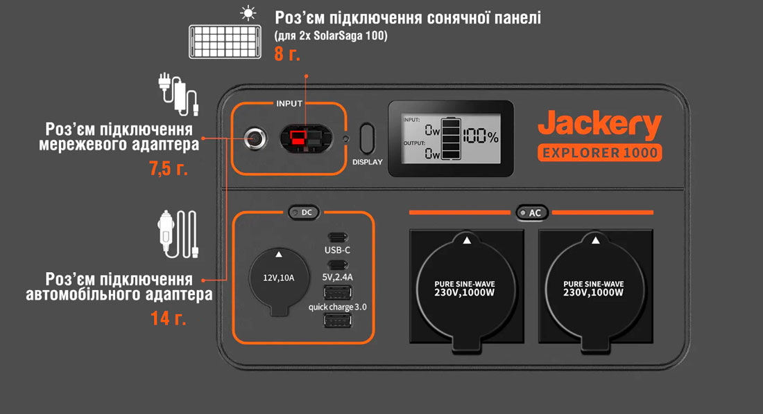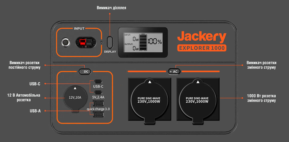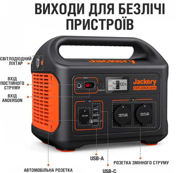 Jackery Explorer 1000EU оснащений різними портами, включаючи USB, USB-C, AC-виходи та DC-виходи, що робить його універсальним рішенням для зарядки безлічі пристроїв.
