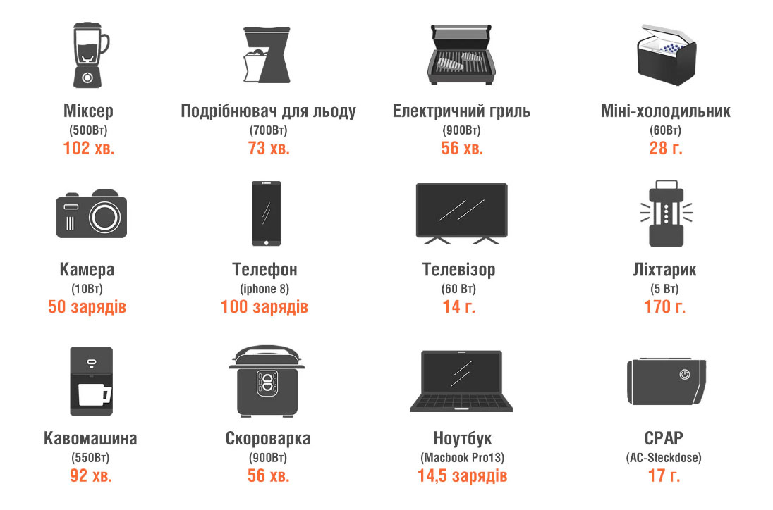 Повна потужність у дії: цей пристрій має достатню енергію, щоб забезпечити роботу більшості невід'ємних пристроїв та електроніки в умовах природи. Підключіть блендер, мультиварку, ноутбук, радіо або навіть проектор – Jackery Explorer 1000 успішно впорається із цими завданнями.