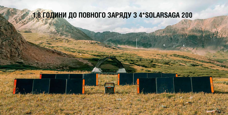 Чотири сонячні панелі SolarSaga 200W встановлюються швидко та надійно завдяки спеціальним стійкам. Вони мають високий коефіцієнт ККД перетворення до 24,3%, що забезпечує ефективне використання сонячної енергії для зарядки Explorer 1000 Pro. Завдяки можливості швидкого заряджання, цей генератор можна зарядити за 1,8 години як від мережевої розетки, так і від чотирьох сонячних панелей SolarSaga 200W, забезпечуючи ефективну та швидку зарядку у будь-яких умовах.