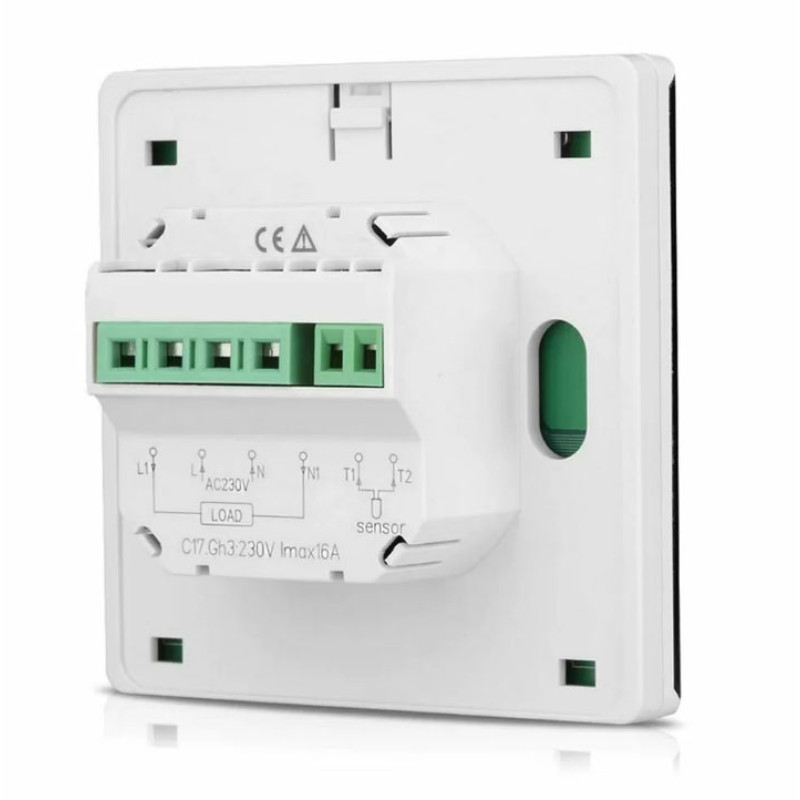 EcoTerm BSN Wi-Fi Black - це програмований терморегулятор, призначений для ефективного керування різними типами електричних підлог, включаючи кабельні, плівкові та алюмінієві мати. Максимальне навантаження пристрою становить 3200 Вт (16 А), забезпечуючи обігрів площі приблизно 15-20 м² теплої підлоги. У комплекті з терморегулятором поставляється виносний температурний датчик завдовжки 3 метри. Пристрій оснащений двома температурними датчиками: виносним для контролю температури підлоги та вбудованим для вимірювання температури повітря.