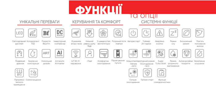 | Функції | Wi-Fi керування Режим "Сон" Теплий старт Розумний потік повітря Smart Air Flow П'ять позицій жалюзі Самодіагностика Авторестарт Таймер 24 години LED підсвічування екрану пульта ДУ Антикорозійне покриття BLUE FIN Економний режим |