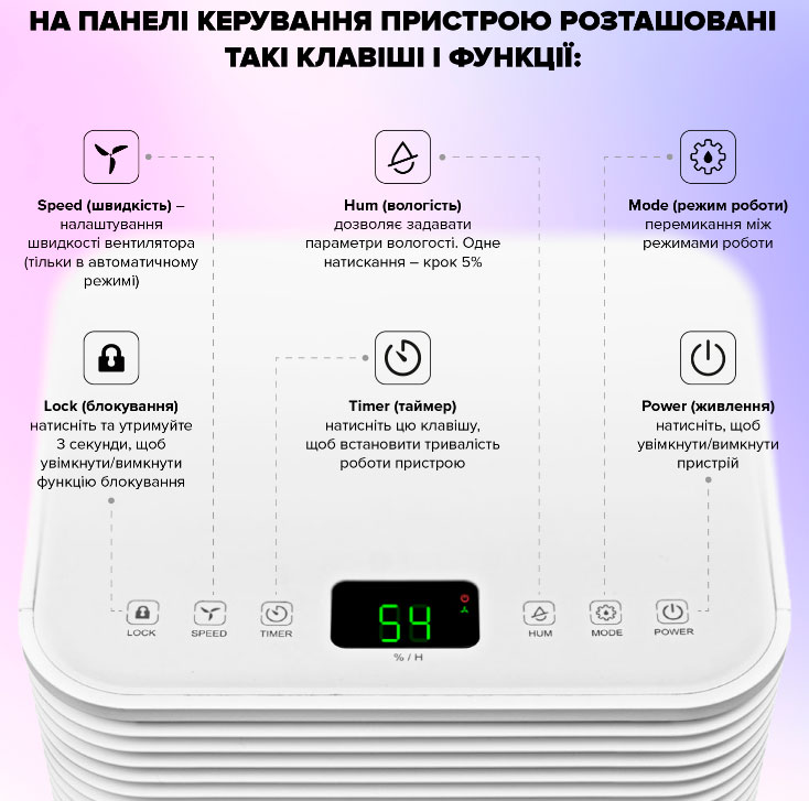 Для зміни режимів використовується кнопка Mode: одне натискання – новий режим. У режимі автоматичної роботи ви можете легко налаштувати як швидкість вентилятора, так і рівень вологості. Переключившись у режим безперервної осушування, пристрій продовжуватиме працювати, але рівень вологості підтримуватиметься на постійному рівні.