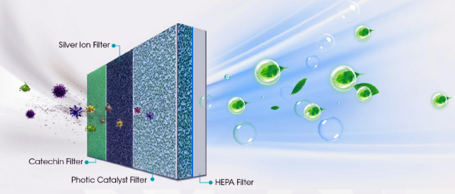 | Функції очищення повітря | Катехіновий фільтр Фільтр з іонами срібла Фільтр із вітаміном C Вугільний фільтр HEPA-фільтр Миючий поліпропіленовий фільтр |