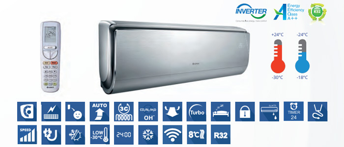 | Функції | Wi-Fi управління Функція "I Feel" Низький рівень споживання енергії Швидкий обігрів/охолодження Плавний пуск Авторестарт Таймер Блокування пульта ДК Годинник на пульті Покриття теплообмінника Blue Fin Режим чергового опалення Захист компресора Запуск при низьких температурах зовнішнього повітря Самодiагностика Система для зниження рівня шуму |