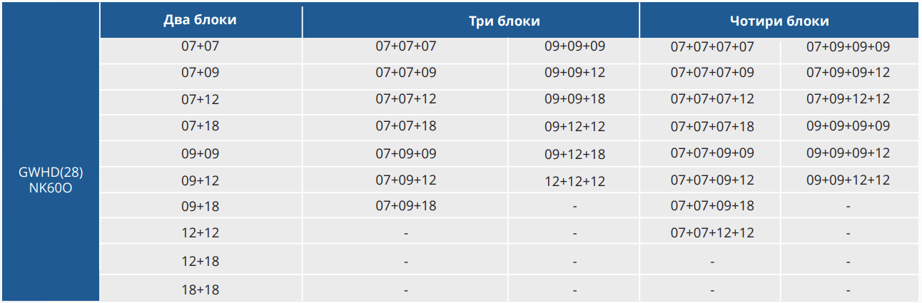 Можливі підключення зовнішнього блоку GWHD28NK6LO та внутрішніх блоків (до 4):