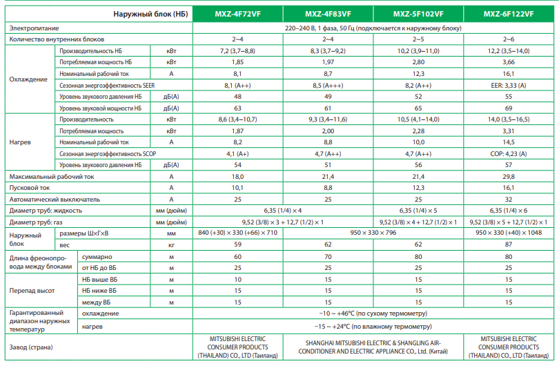 Технічні характеристики моделі Mitsubishi Electric MXZ-6F122VF