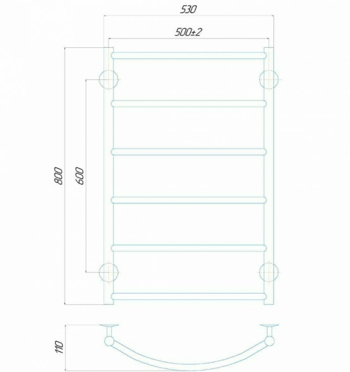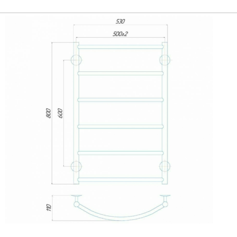 - Розміри: ця рушникосушарка має висоту 800 мм і ширину 500 мм, що надає достатньо місця для підвішування рушників різних розмірів та інших текстильних виробів.