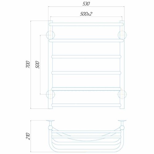 Присутність полички створює додатковий простір для зручного розміщення рушників або інших аксесуарів, забезпечуючи стильною ванною. Верхня частина рушникосушарки обладнана вбудованою полицею, надаючи зручне місце для розміщення рушників. Під полицею знаходиться ряд перемичок дугоподібної форми, які надають додатковий шарм дизайну та забезпечують зручність при сушінні різних предметів.