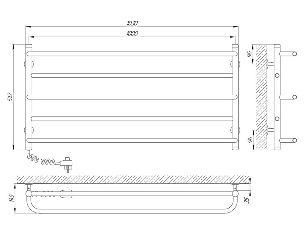 - Лівостороннє розміщення шнура: електричний сушка для рушників підключається до електромережі зліва, забезпечуючи зручність підключення і гармонійний вигляд.