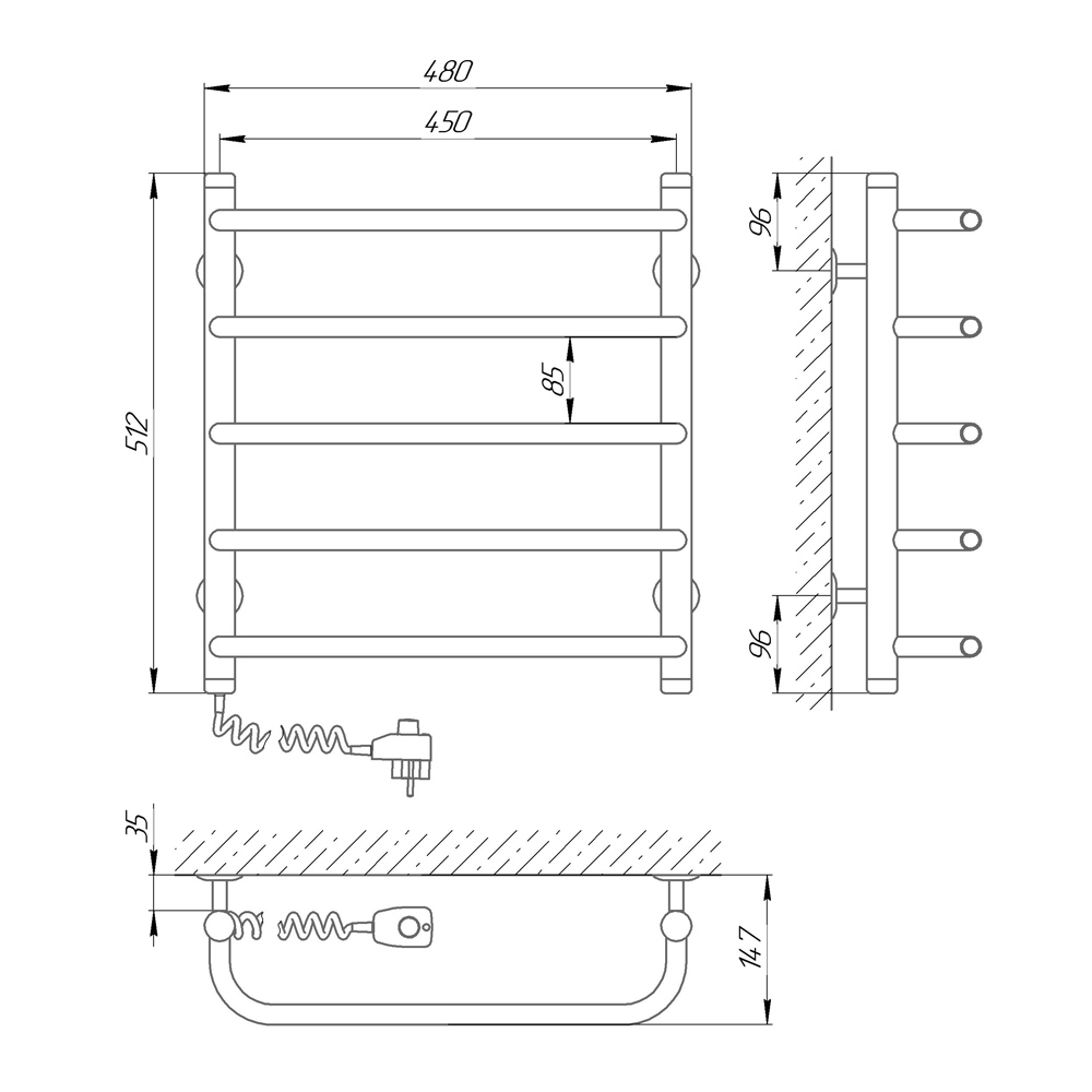 - Габарити та форма: з розмірами 450 х 500 мм і висотою 512 мм, ця рушникосушка підходить для різних розмірів ванних кімнат. Її компактна форма та невелика глибина 147 мм дозволяють оптимально використовувати простір.