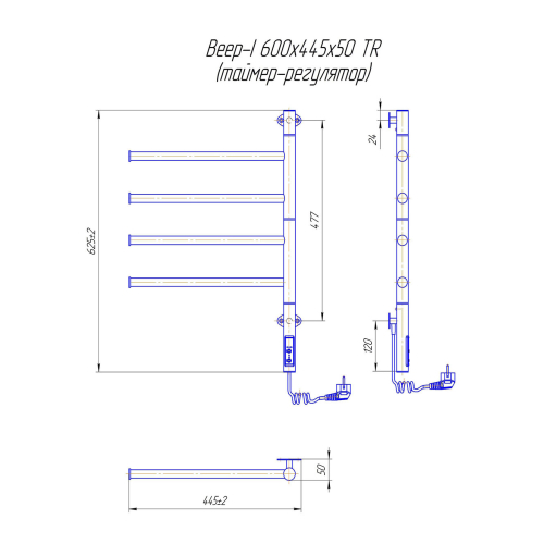 Також рушникосушка оснащена регулятором температури на стійці, який пропонує три варіанти температурного режиму: 40 °C, 45 °C і 50 °C. Це дозволяє вибирати оптимальну температуру в залежності від ваших потреб. Для економії електроенергії у конструкції передбачено таймер, який можна налаштувати на 3 або 6 годин роботи. Це дозволяє автоматично відключати сушарку для рушників після заданого часу, що зручно і безпечно.