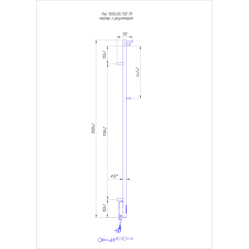 Електрична побутова рушникосушарка Рей-І 1500х30/130 TR (арт. 2.21.1103.15.Р). Обладнаний таймером-регулятором, що дозволяє заощадити до 60% електроенергії, має температурні режими: 40°С, 45°С, 50°С, з варіантами часу: 3, 6 годин та постійне нагрівання. Виготовлений із полірованої нержавіючої сталі без хромування. Стояк круглої форми з 2 гачками (поворотні).