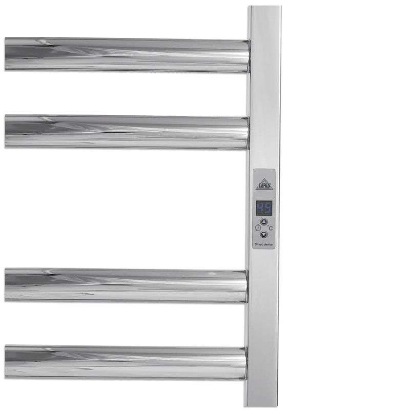 Розміщення шнура праворуч забезпечує зручність підключення та встановлення пристрою, що робить її інтеграцію з ванною кімнатою ще зручнішою. Таке розміщення дозволяє уникнути перетину шнура з рушниками та іншими елементами ванної кімнати. Особливістю регулятора температури є його двокнопковий механізм. Це дозволяє вам легко і точно налаштувати температуру сушіння відповідно до ваших потреб. Ви можете вибрати оптимальну температуру для швидкого та ефективного сушіння рушників, що сприяє економії енергії.