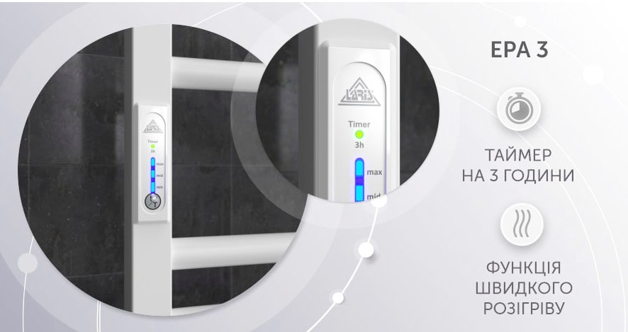 Особливості: керує нагріванням електричної сушки для рушників мікропроцесорний термоконтролер (кнопкове управління). Для початку роботи необхідно задати температуру сушки для рушників. Термодатчик контролює температуру поверхні сушки для рушників, що виключає його перегрів. Серед переваг регулятора - збереження обраного режиму роботи (при відключенні робота відновиться у запрограмованому користувачем режимі), наявність таймера відключення (3h) та колірної індикації роботи!