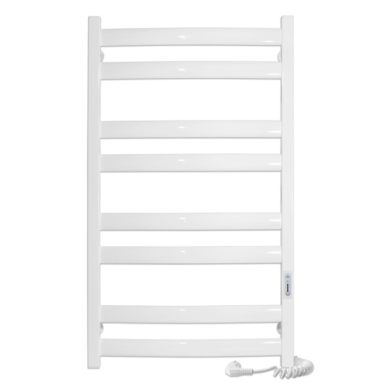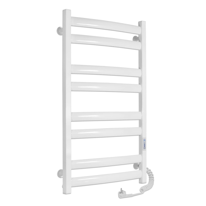 Сушка для рушників оснащена регулятором температури, який знаходиться на стійці і є програмованим. Це дозволяє легко налаштувати бажану температуру обігріву, забезпечуючи комфорт та економічне використання електроенергії. Шнур пристрою розміщений праворуч, що забезпечує зручне підключення до електромережі без необхідності перетягування шнура через всю рушникосушарку . Кількість перемичок становить 8, які розподілені рівномірно у горизонтальних рядах - по 2 перемички у кожному ряду. Таке розміщення забезпечує рівномірний розподіл тепла та створює достатньо місця для розміщення кількох рушників одночасно.