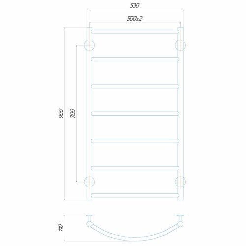 - Розміри: з висотою 900 мм і шириною 500 мм, ця рушникосушарка надає достатньо місця для підвішування та обігріву рушників, а також інших текстильних виробів.