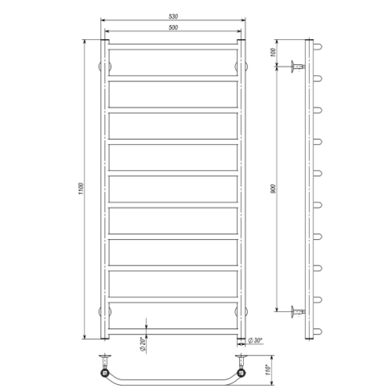 Водяна рушникосушарка Deffi Трапеція П10 500x1100 В (Т 110.50.10 BP) бічне підключення