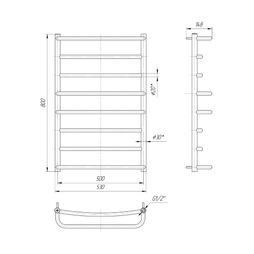 - Висота 800 мм і ширина 530 мм створюють естетичні пропорції, дозволяючи легко вписати рушникосушарку у дизайн вашої ванної кімнати.
