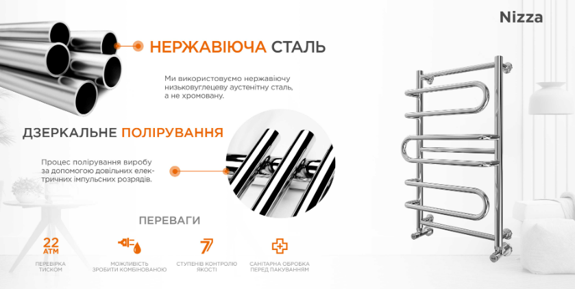 Відповідно до стандарту, рушникосушарка Mario Практик Ніца (1.1.4301.01.P) поставляється в елегантній хромованій обробці. Однак, ми також пропонуємо різноманітні варіанти кольору для більш ретельної відповідності вашому інтер'єру. Крім цього, дана рушникосушка може бути додатково обладнана електричним ТЕНом, забезпечуючи додатковий рівень комфорту.
