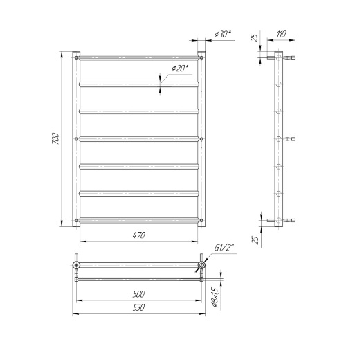 Створений з урахуванням естетики та практичності, рушникосушарка має міжосьову відстань для підключення 500 мм, що забезпечує зручність монтажу. Діаметр підключення G 1/2'' забезпечує сумісність із різними системами водопостачання. Складається з 7 ребер, водяна рушникосушарка забезпечує рівномірний прогрів і ефективну сушку рушників. Розташування ребер різних рівнях створює зручні проміжки для розвішування рушників, забезпечуючи оптимальний доступом до них.