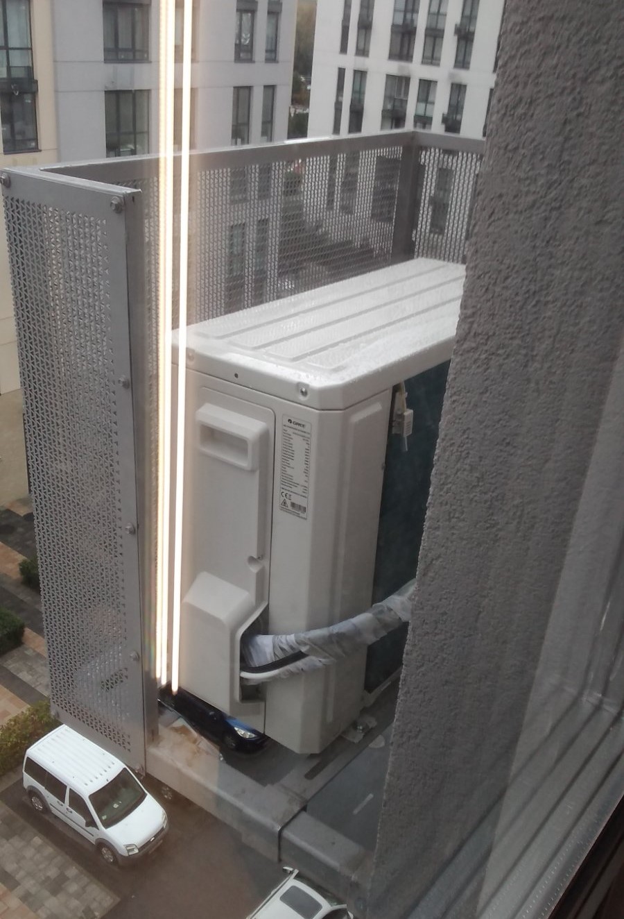 Зовнішня частина кліматотехніки кріпиться далеко від просторів з інтенсивним рухом, запорошених і спекотних місць. Від місця, де була встановлена внутрішня частина системи, потрібно розташувати блок так, щоб було зручно підключити трубу та кабель живлення. Розташування має бути затемненим, захищеним від різких поривів вітру. Після монтажу з'єднується труба та кабель із зовнішньою системою. Тільки після зіставлення схеми від виробника з виробленою лінією живлення, можна вмикати кондиціонер у розетку. Термін експлуатації техніки та правильність її функціонування залежить від співвідношення кріплення блоків та лінійності лінії електроживлення.